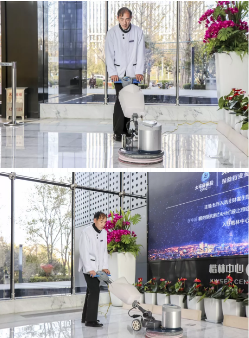 “清理时间一定要把控好。时间长了,容易花;时间短了,亮度会不够;所以我一般把时间控制在7—10分钟。而且必须采用从前至后,从左到右的移动顺序按部就班地一块一块的进行处理……”现如今,在郭师傅的眼里,每月一次的石材结晶养护已经手到擒来。从事养护工作四、五年的郭师傅知道,石材结晶养护是非常耗时耗力,加之机器难以掌握,稍有不慎,便会碰坏周边的物品或伤害自己,可谓是对技术要求甚高的工种。而郭师傅日复一日的坚持这项工作,显然已经摸清了其中的“门道”。